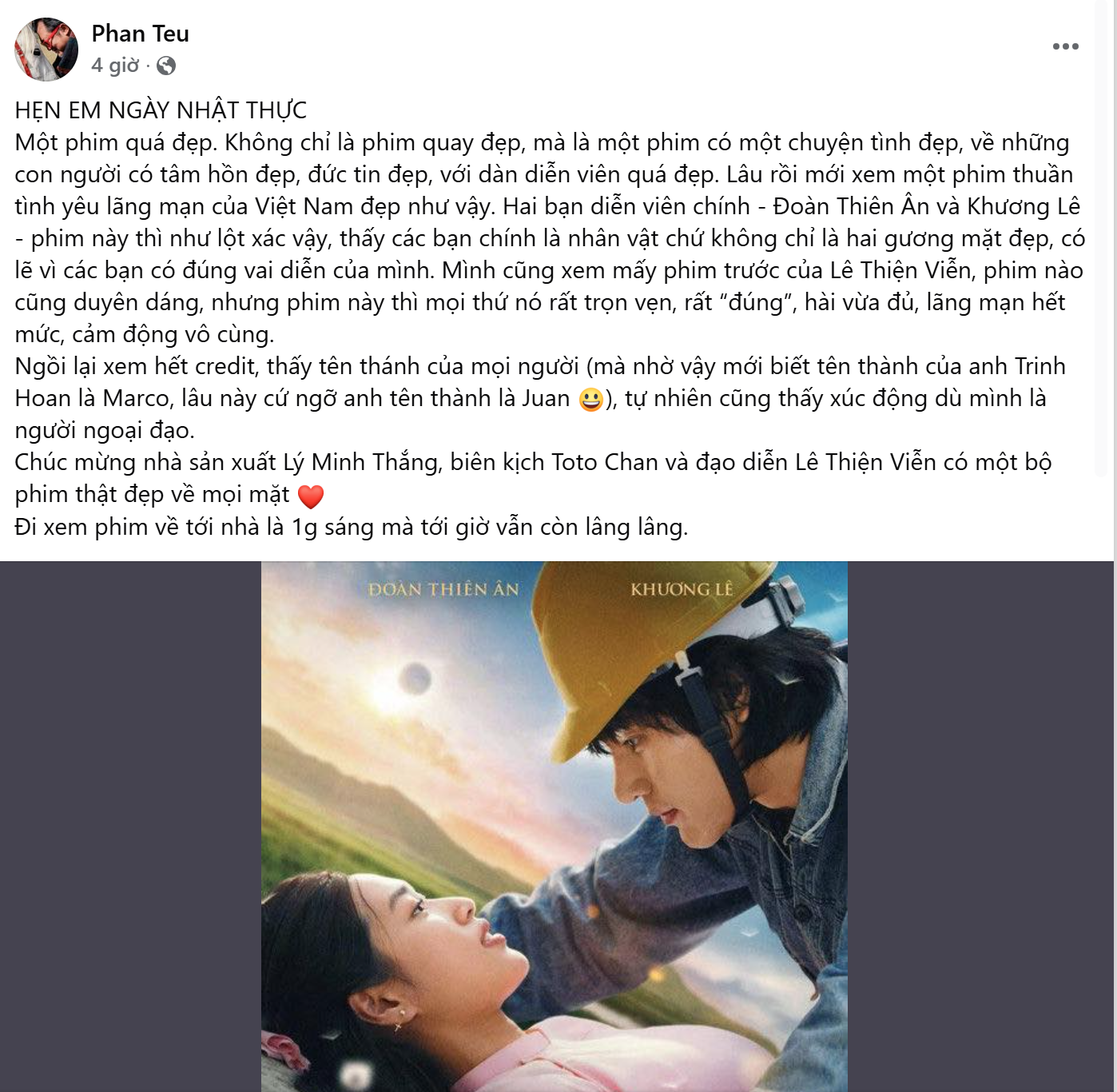 Ở góc độ của một người làm báo lâu năm, Nhà báo Nguyễn Hà Sơn cũng dành những lời khen có cánh cho phong cách kể chuyện của Lê Thiện Viễn. Chị nhận xét rằng dù sở hữu một cốt truyện đơn giản, nhưng đạo diễn đã rất khéo léo trong việc dẫn dắt để tạo nên một sức hút khó cưỡng, mang đến những khoảnh khắc xúc động đến mức “lấy được nước mắt” khán giả. Đặc biệt, chị đánh giá cao sự “mát tay” của Lê Thiện Viễn trong việc khai thác diễn xuất của diễn viên. Chị bày tỏ sự bất ngờ trước sự lột xác của Thiên Ân với sự nhập vai cực kỳ tự nhiên, không còn cảm giác bị gồng hay thoại thiếu mượt mà. Với chị, xem “Hẹn em ngày nhật thực” là một trải nghiệm dễ chịu và hoàn toàn xứng đáng, nơi đạo diễn đã thành công khi tạo ra một không gian điện ảnh đủ sức “ám ảnh” khiến người xem khi trở về nhà vẫn chưa thể thoát khỏi câu chuyện tình của hai nhân vật chính.