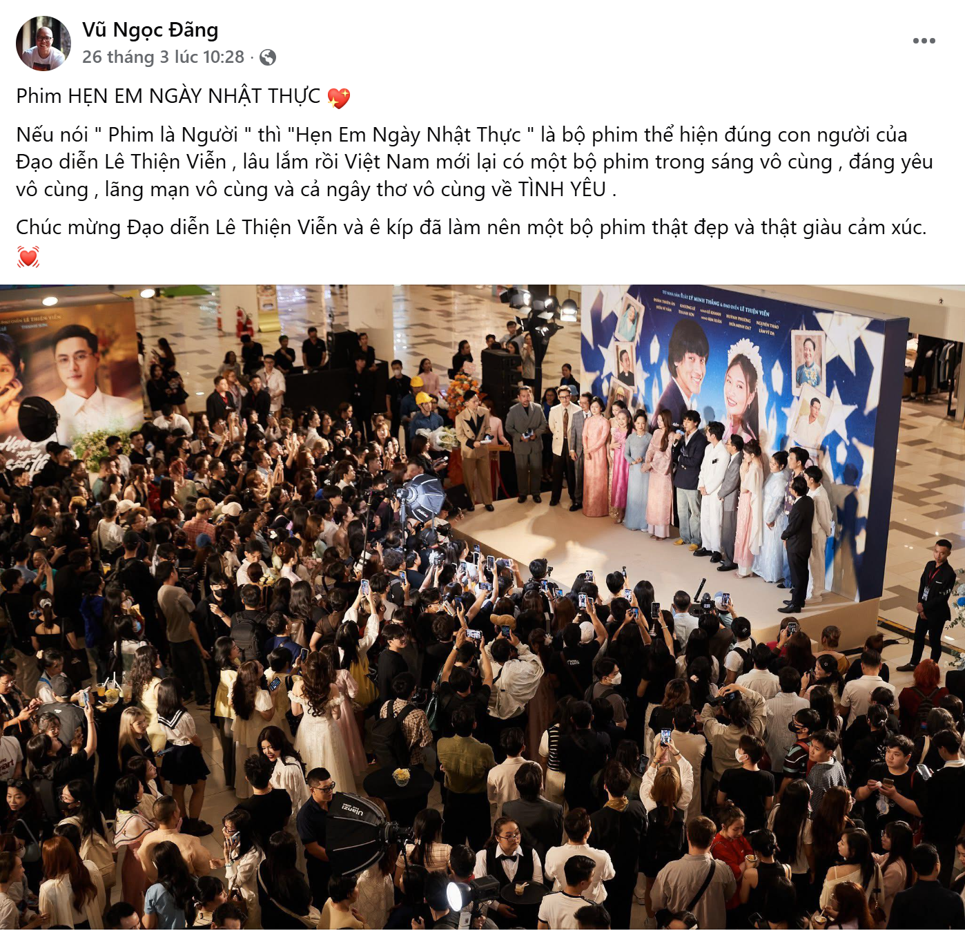 Dù đến ngày 3/4 mới chính thức ra rạp, tác phẩm điện ảnh “Hẹn em ngày nhật thực” của đạo diễn Lê Thiện Viễn đã sớm khẳng định sức hút mãnh liệt, đã nhanh chóng tạo nên hiệu ứng tích cực ngay từ những suất chiếu sớm bắt đầu từ 27/3. Không chỉ nhận được sự yêu mến từ khán giả đại chúng, bộ phim còn bất ngờ “phủ sóng” mạng xã hội khi hàng loạt đạo diễn, diễn viên và nhà phê bình đồng loạt chia sẻ sự đánh giá cao ở chuyên môn và cảm nhận tích cực về cảm xúc tạo nên hiện tượng trên mạng xã hội.